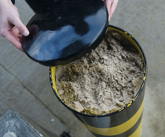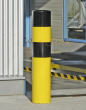 BOLARDO TUBO DE 6" CON PINTADO DE AMARILLO, CON CINTAS REFLEJANTES NEGRAS, Y RELLENO DE CEMENTO
