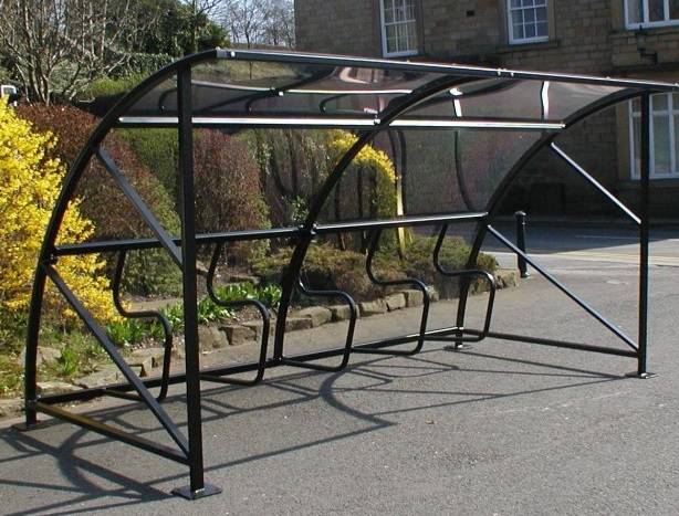 con policarbonato, estructura acero galvanizado, pintura anti corroción.