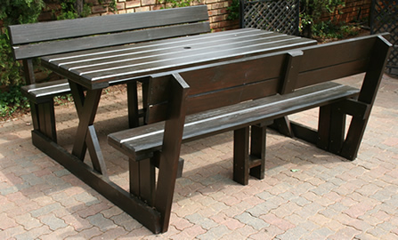 Mesa picnic de madera y acero con asientos con respaldo de madera tratada para exteriores