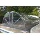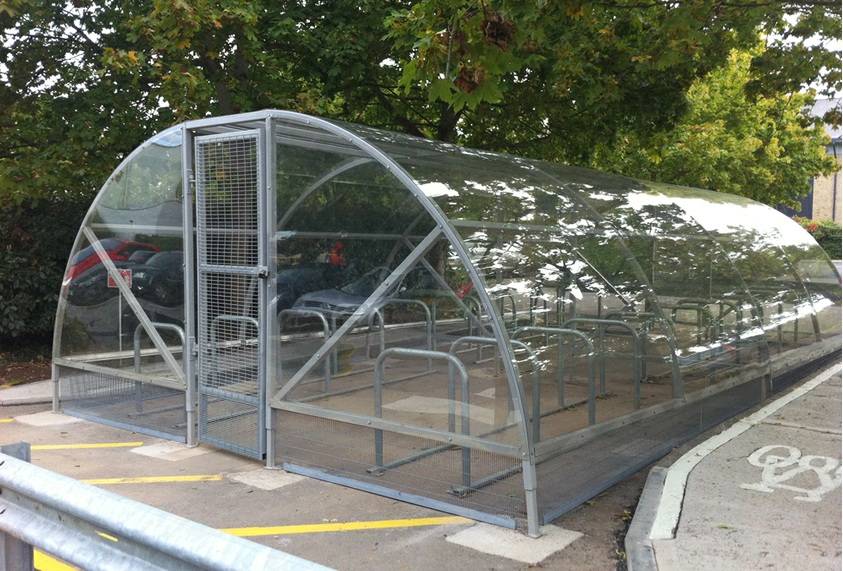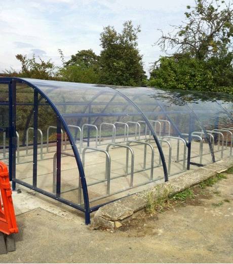 Techo para estacionamiento bicicletas, modelo invernadero, cubre en un área de 10 m x 4 m a más de 60 bicicletas.