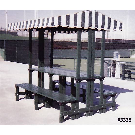 fabricada en estructura de acero, pintada del color a las necesidades del cliente, madera tratada para la interperie, toldo de lona 16 onzas