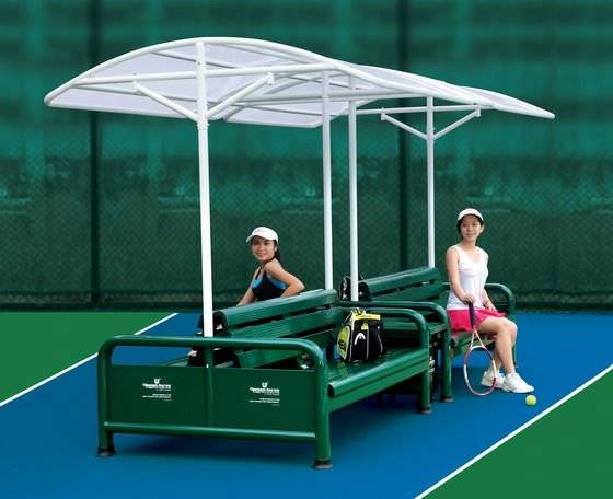 Banca Doble central metálica para canchas de tenis, techo curvo con malla sombra,