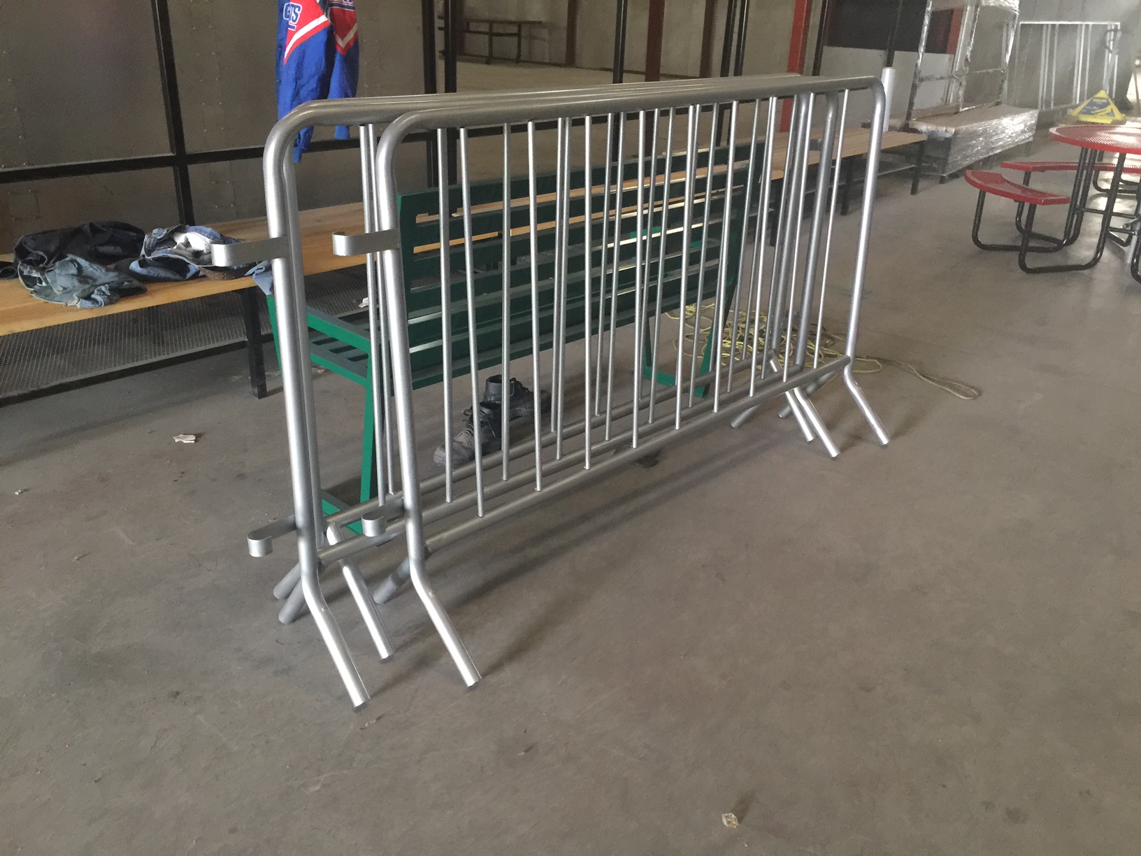 Vallas de acero, medida 2.0 m largo x 1.10 m altura, contiene 9 tubos en parte central, 1 gancho lateral, 2 patas estilo crossed foot ayudan al montaje y desmontaje rapido , el acabado es pintura electroestatica color a selección del cliente.